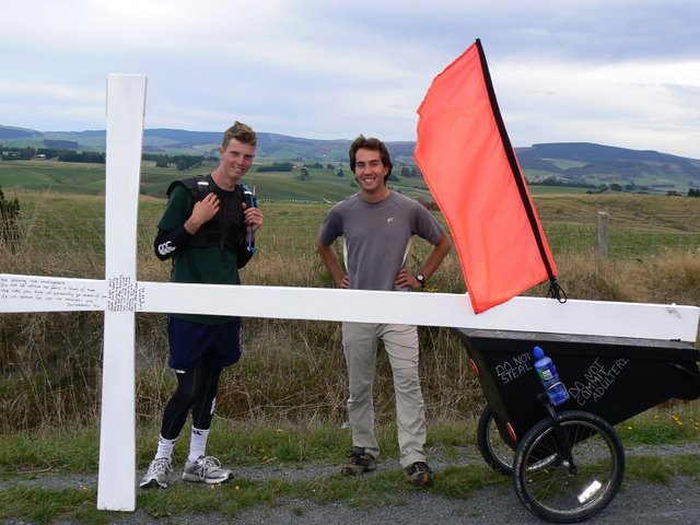 Pour ceux qui pensent que l'on est fous, si, il y en a, je sais c'est honteux, en même temps, qui me dit que ce n'est pas toi ? Bref, on a trouvé notre maître ! Sur la route de Dunedin, on a rencontré un ptit jeune qui, comme on dit, a la foi ! Il fait son petit bonhomme de chemin… de croix, pendant trois mois pour une grosse boucle d'environ 2000km en Nouvelle-Zélande. Respect l'apôtre ! Si je me mets au bouddhisme après notre passage en Thaïlande, promis je fais pareil avec un bouddha de 500kg en granit des Vosges.